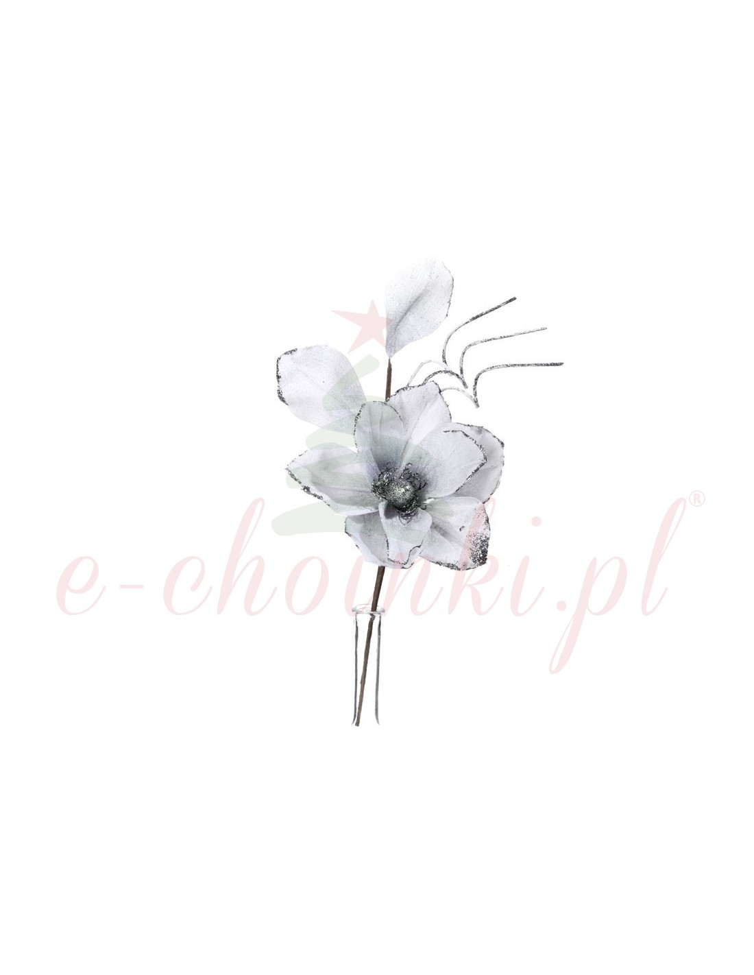 45 cm ilgio baltoji magnolija. Kalėdinė šaka su magnolijos žiedu papuošta dekoratyviniu blizgučiu. Tai bus puiki dekoracija kalėdinėms kompozicijoms.