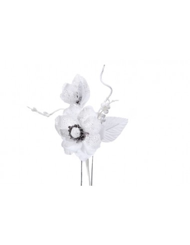 Magnolija balta kompozicija 20 cm ilgio. Šventinė šakelė su dviem gėlėmis ir papildomais akcentais, papuošta sidabriniu blizgučiu.