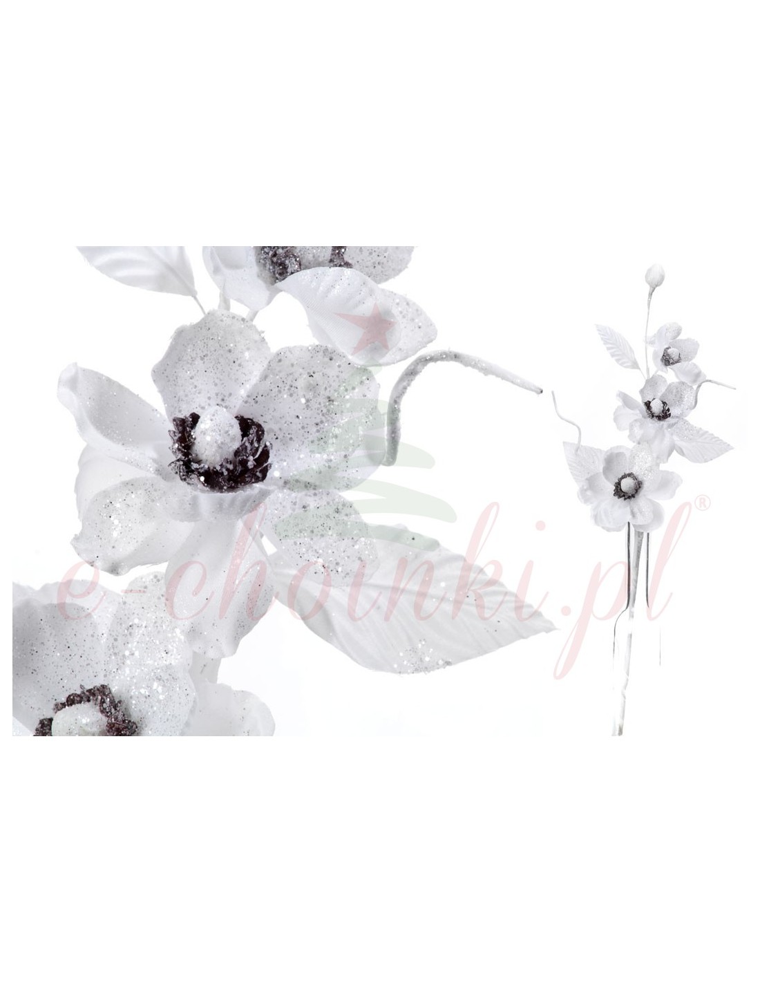 Magnolijos kompozicija balta, 44 cm ilgio. Šventinė šakelė su trimis magnolijų žiedais, papuošta sidabriniais blizgučiais.