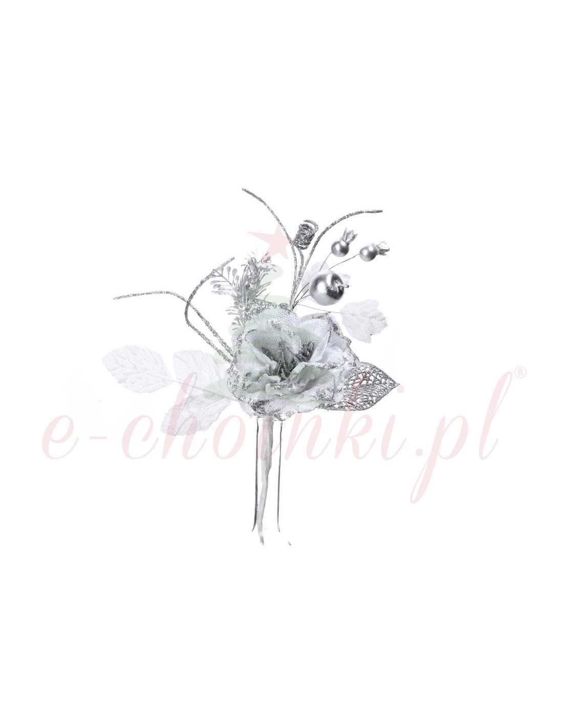 Balta roze ar sudraba spīdumu 28 cm garumā. Rožu un zariņu kompozīcija būs skaists papildinājums svētku dekorācijām.